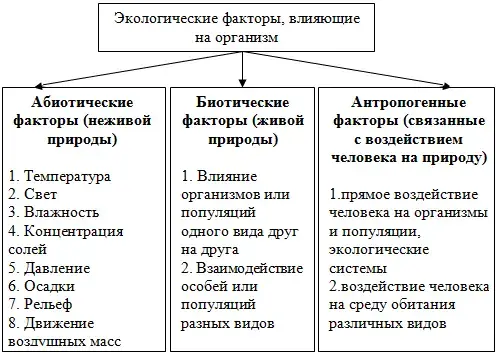 Экологические факторы - это отдельные свойства или элементы среды, воздействующие прямо или косвенно на живые организмы, хотя бы на протяжении одной из стадий индивидуального развития. Экологические факторы многообразны. Существует несколько квалификаций, в зависимости от подхода. Это по влиянию на жизнедеятельность организмов, по степени изменчивости во времени, по длительности действия. Рассмотрим классификацию экологических факторов, основанную на их происхождении.