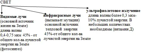 Свет обеспечивает все жизненные процессы, протекающие на Земле. Для организмов важна длина волны воспринимаемого излучения, его продолжительность и интенсивность воздействия. Например, у растений уменьшение длины светового дня и интенсивность освещения приводит к осеннему листопаду.