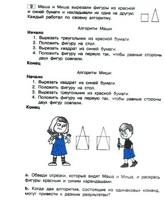 (На фланелеграфе выставлены 4 геометрические фигуры: два красных треугольника и 2 синих квадрата). На доске два ученика накладывают фигуры соответственно алгоритму Маши и алгоритму Миши.