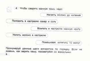 Дома вам надо вместе со взрослыми "сварить" самую любимую манную кашу и пронумеровать шаги алгоритма.