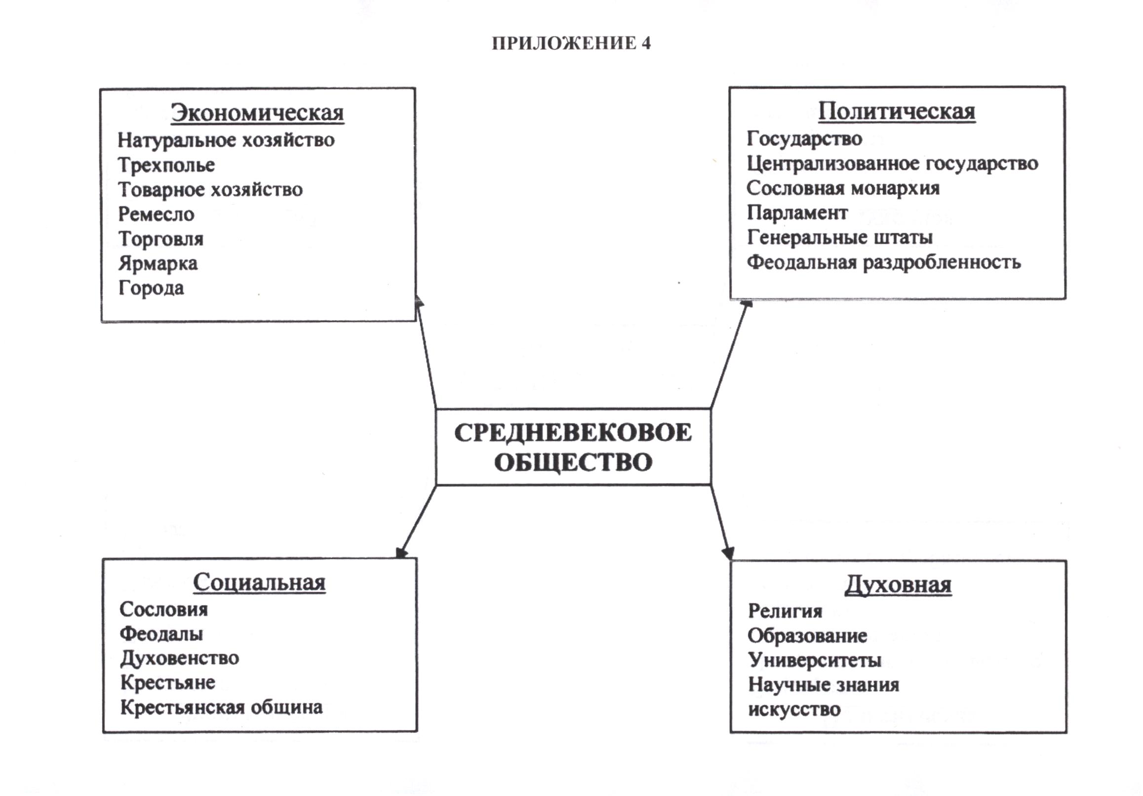 Вернемся к нашей задаче: выявить основные черты средневекового общества (учащиеся с помощью понятий изученных в курсе средних веков заполняют схему)