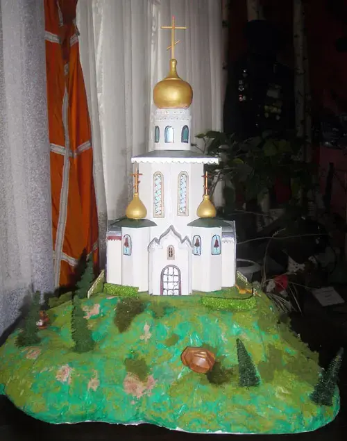 Стены и купола выполняются из деревянных брусков разного размера, кресты из спичек, зубочисток. Колонны вырезаются из картона, зубчатые причелины из старой фотопленки.