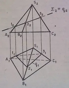 Решение. Сечение q - ломаная линия. Ее вершины 1, 2, 3 - точки пересечения ребер пирамиды с плоскостью Σ : 1=SА ∩ Σ, 2= SВ ∩ Σ, 3= SС ∩ Σ ; q2 ≡ Σ2, т.к. Σ ┴ Π2 ; отмечаем точки 12, 22, 32 и строим 11 принадлежащую S1A1, 21 принадлежащую S1В1, 31 принадлежащую S1С1. Соединяем построенные точки с учетом их видимости. Т.к. грань SACотносительно плоскости проекций Π1 невидима, то отрезок 1-3 (11 - 31) тоже невидим.