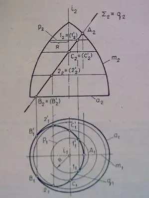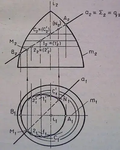- Рассмотреть вопрос о построении точек, получаемых при пересечении кривых поверхностей плоскостью и прямой линией.