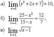 Ранее, при вычислении пределов нами было установлено, что если рациональная функция имеет значение при х = а (т.е. подстановка х = а не приводит к делению на 0), то предел этой функции равен ее значению в точке а.