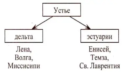 Устья у рек могут быть разные. Эстуарии - воронкообразное устье реки, расширяющееся в сторону моря. Дельта - форма устья реки с протоками, на которые делится главное русло. Дельты чаще всего имеют треугольную или веерообразную форму. Дельты образуются на мелководных участках моря или озера при впадении реки, несущей большое количество наносов.