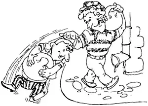 - "В одиннадцатом часу вечера молочные братья, кренясь под тяжестью двух больших гирь, шли по направлению к конторе. Паниковский нес свою долю обеими руками, выпятив живот и радостно пыхтя... Здоровяк Балаганов держал гирю па плече. Иногда Паниковский никак не мог завернуть за угол, потому что гиря но инерции продолжала тащить его вперед. Тогда Балаганов свободной рукой придерживал Паниковского за шиворот и придавал его телу нужное направление". (И. Ильф и Е. Петров, "Двенадцать стульев")