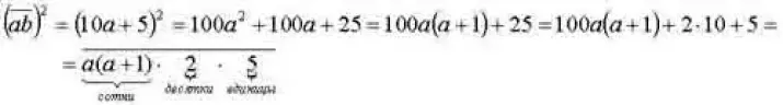 Вывод: Чтобы возвести в квадрат двузначное число, оканчивающееся на 5, нужно умножить цифру, которая изображает число десятков в данном числе на следующую за ней цифру (в натуральном ряду) и к результату справа приписать 25.
