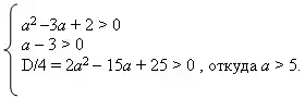 Решение. Если а2 - 3а + 2 < 0, т.е. 1 < а < 2, то уравнение имеет корни разных знаков. В остальных случаях или корней нет, или они одного знака. Отдельно надо рассмотреть те случаи, когда корни равны или один из них равен 0. В случае положительности дискриминанта и свободного члена на основании теоремы Виета знаки обоих корней противоположны по знаку коэффициенту при х. Значит, для того чтобы было х1 > 0 и х2 > 0, необходимо и достаточно выполнения неравенств: