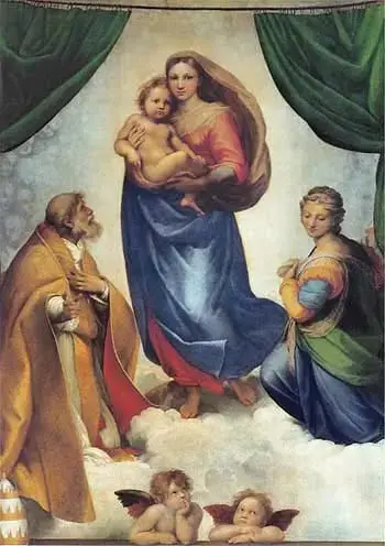 Das Gemälde " Die Sixtinische Madonna " ist ein Meisterwerk von Raffael. Der italienische Maler war 32 Jahre alt, als er dieses Bild geschaffen hat.