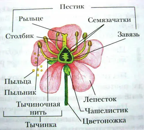 Главные части цветка - пестик и тычинки. Из завязи после оплодотворения развивается плод, а из семязачатков образуются семена. Тычинки состоят из тычиночной нити и крупного пыльника. Внутри пыльника развивается пыльца, в которой образуются мужские половые клетки - спермии.