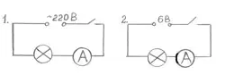 Ученики видят ,что лампа в (1) светит ярче, чем лампа в (2). Сила тока в цепях одинаковая, а напряжения разные.