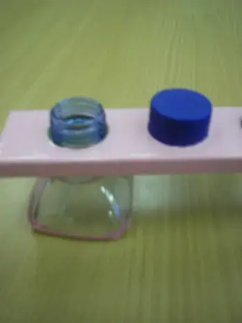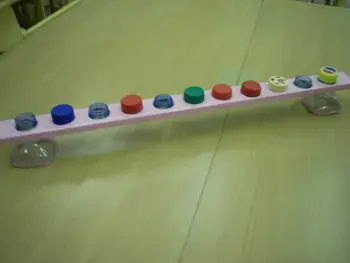 Для изготовления пособия нужно: деревянные бруски размером 45 см х 5 см, пробки, горлышки от пластиковых бутылок , 4 пластиковые бутылки по 0,5 л, картонные карточки размером 5 см х 10 см, клей «Момент». (Рисунок 1)