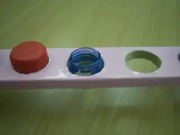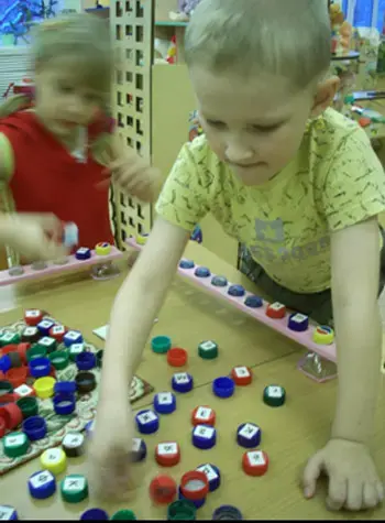 - выбирает соответствующего цвета пробки, навинчивая их в определенной последовательности на горлышки, утрированно произнося каждый звук