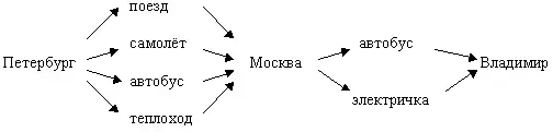 Решение: Сначала следует выбрать один из четырёх возможных способов путешествия из Петербурга в Москву, а затем - один из двух способов путешествия из Москвы во Владимир. Значит всего получается 4•2=8 способов путешествия. (Это рассуждение лучше проводить с опорой на рисунок.)