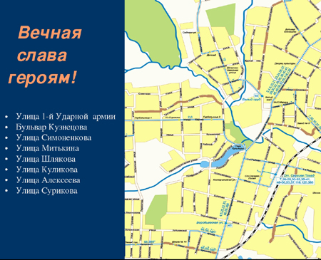 Это улицы Симоненкова, Митькина, Алексеева, Куликова, Сурикова, Шлякова. За мужество и героизм этим людям присвоено звание Героя Советского Союза.