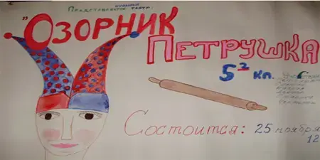 Тема нашего проекта - создание афиши. Афиша (фр.)- вид рекламы, объявление о спектакле, концерте, вывешиваемое в публичных местах. Цель афиши - привлечь внимание зрителей, вызвать интерес к спектаклю или концерту, сообщить основную информацию о нем. Афиша должна быть яркой, поэтому мы крупно написали название «Озорник Петрушка», чтобы оно выделялось. Ниже поместили список действующих лиц и исполнителей. Сообщили, когда состоится представление. В центре мы решили нарисовать Петрушку - ведь он главный герой пьесы. Любимец публики. И каждый, кто захочет повстречаться с ним, обязательно придет на спектакль.
