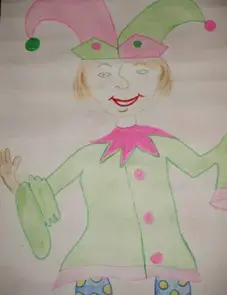 Петрушку мы нарисовали в яркой рубашке и шапочке. Шапочка с бубенчиками или кисточками. Рубашка с нарядным воротничком, просторная. Этот костюм можно легко надеть и быстро приготовиться к представлению. Как только соберется публика, будет совсем не трудно сразу же начать выступление. Петрушка веселый, озорной, жизнерадостный, удалой. Никогда не унывает, всех рассмешит своими шутками.