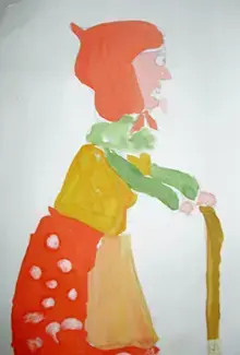 Старуха. Хочет, чтобы её уважали и боялись, обращали внимание и замечали её, так что её наряд тоже яркий. Она в красном платке и красной юбке, но сама злая, недобрая. И это сразу видно по выражению её лица.