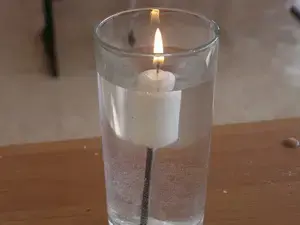 И, правда, свеча будет понемножку всплывать, причём охлаждённый водой парафин у края свечи будет таять медленней, чем парафин, окружающий фитиль. Поэтому вокруг фитиля образуется довольно глубокая воронка. Эта пустота, в свою очередь, облегчает свечу, потому-то наша свеча и догорит до конца.