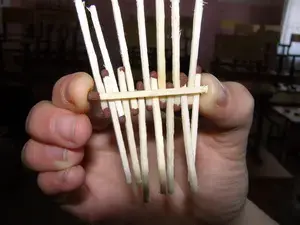 - Положить одну спичку на стол, а на неё поперёк 14 спичек так, чтобы головки их торчали кверху, а концы касались стола.