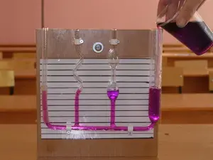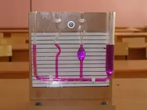 - Затем налить воды почти до края. Можно увидеть, как струя вина поднимается через одно из отверстий до уровня воды, между тем как вода, более тяжёлая, пройдет через другое отверстие и станет опускаться ко дну бокала. Через несколько мгновений вино очутится на верху, а вода внизу.