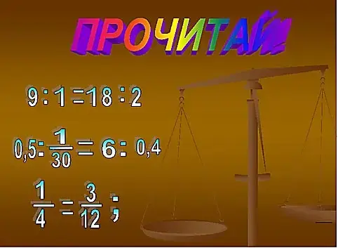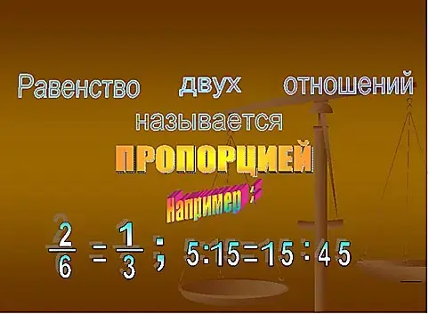 После просмотра слайда ученики повторяют определение пропорции, рассказывая, его друг другу (работа в парах). Учитель на доску помещает табличку "отношений".