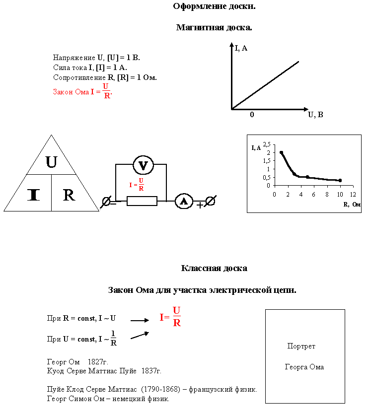 Демонстрационные амперметр и вольтметр, источник тока В-24, ключ, соединительные провода, демонстрационный магазин сопротивления, ТСО, кодоскоп, экран, магнитная доска, магниты, портрет Ома, таблицы с формулами.