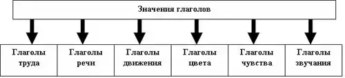 Адвокат: Уважаемый суд! Позвольте напомнить всем присутствующим в этом зале, что слово «глагол» имеет древнюю историю. В старославянском языке было слово «глаголати» со значением говорить, отсюда «глагол» означало слово «речь». Хочу предоставить вещественные доказательства, а присутствующих подтвердить их примерами. (На доску вывешивается таблица «Значения глаголов».