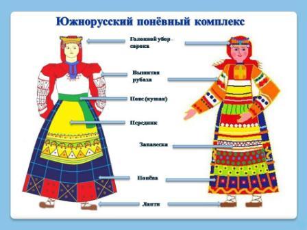 Старинный женский костюм можно разделить на два типа: южнорусский и северорусский. Южнорусский комплекс отличался наличием понёвы, передника-занавески, поверх