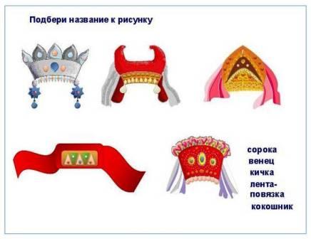 Учащиеся подбирают соответствующие надписи к представленным рисункам старинных женских головных уборов и, выделяя их, перетаскивают под выбранный рисунок.