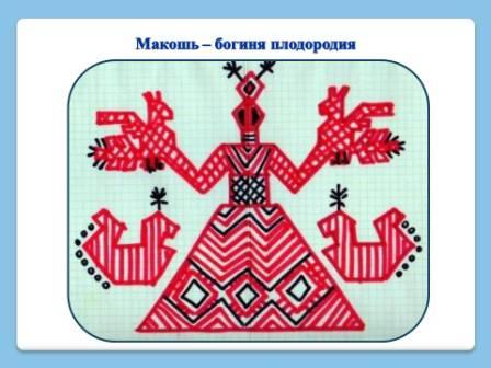 земля»). Образ древней богини Макоши - матери хорошего урожая всегда связывался с символами плодородия (древом, птицами, животными, солнечными знаками). Часто фигура решалась