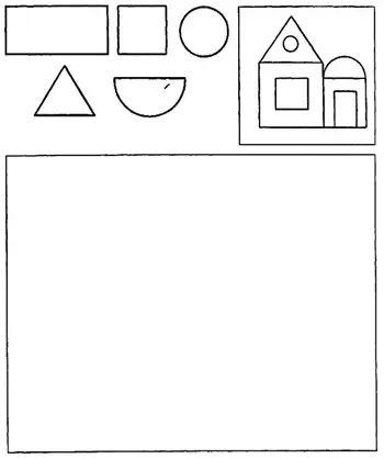 Придумай, что можно нарисовать из этих геометрических фигур. Каждую фигуру можно использовать по нескольку раз и можно менять их размеры. Но другие фигуры использовать нельзя. Например, как показано на картинке.