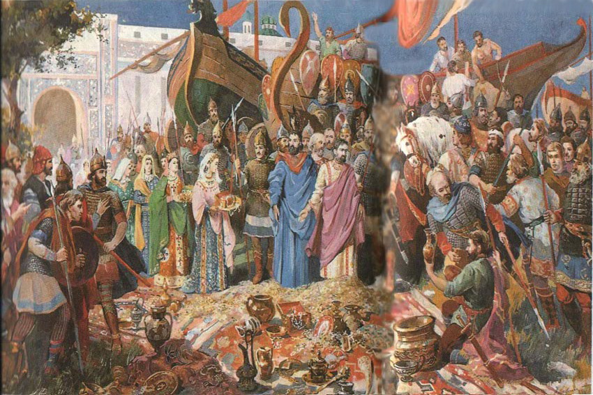 Д: - Образование первого Русского государства. Славянские племена пригласили на княжение трёх варяжских братьев: Рюрика, Синеуса и Трувора. Рюрик стал княжить в Новгороде. Синеус в Белоозере. Трувор в Изборске. Через 2 года, после кончины Синеуса и Трувора, Рюрик присоединил их земли к Новгороду. Так было основано Древнерусское государство.