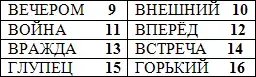 21.Мягкий. 22. Нездоровый. 23. Ложь. 24.Урод. 25. Хуже. 26. Много. 27. Правда. 28.Оправдывать. 29.Соглашаться. 30. Последний. 31. Хороший. 32. Спуск. 33. Ложь. 34. Сторонник. 35. Грусть. 36.Тьма. 37. Слабый. 38. Шум. 39.Глупый. 40. Плохой. |