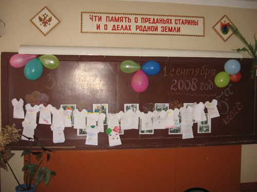 На доске слева красочная надпись "Здравствуй, школа", справа - дата: 1 сентября 2008 г. доска украшена фотографиями ребят, сделанными на выпускном вечере в 4 классе. Над фотографиями - верёвка с прищепками-скрепками. Столы расставлены таким образом, чтобы центр класса был пустым.