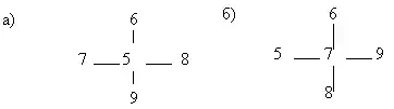 - Расположить числа 5, 6, 7, 8, 9 так, чтобы сумма чисел по каждой линии была равна а) 20; б) 21.