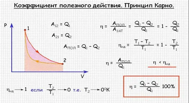 Так как одной из составляющих теплового двигателя является холодильник, то нельзя избежать потерь энергии. Тогда необходима физическая величина, показывающая эффективность работы двигателя эту величину назвали КПД.