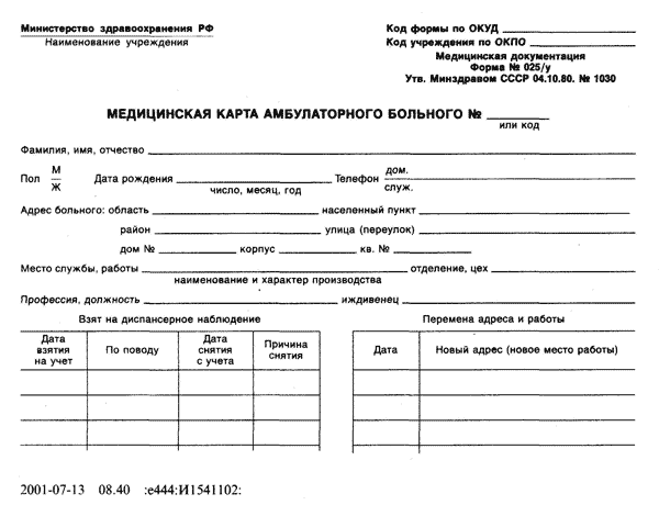 Код учреждения по ОКПО Медицинская документация Форма № 025/у Утв. Минздравом СССР 04.10.80. № 1030 |