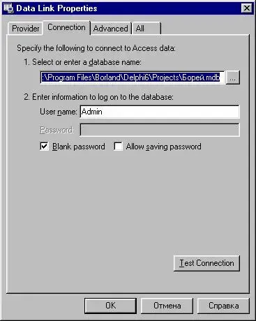 На вкладке Connection можно указать имя базы данных, имя пользователя и пароль (для защищенных баз данных). Нажав кнопку Test Connection, можно проверить правильность функционирования соединения. Далее можно нажатием кнопки ОК установить строку соединения, либо перейти на остальные две вкладки.