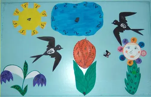 Здесь светит математическое солнце, (на доску вывешивается картинка "солнце"), поют математические птички, математические цветы качаются на ветру. Вдруг набежала туча на солнышко (на доске рисунок солнышка закрывается рисунком "туча"), и всё вдруг потемнело. Перестали петь птички, поникли цветы. Давайте освободим солнышко. Для этого нам надо выполнить несколько заданий.