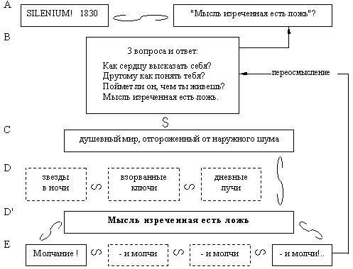 Смысловой фокус стихотворения - афористическое выражение философской мысли, познанной поэтом истины: "Мысль изреченная есть ложь". Фокус основан на тематическом образе молчания, вынесенном и в заглавие. Им начинается и завершается стихотворение: "молчанием" лирический герой стремится "окольцевать" богатый мир души - рвущихся наружу, стремящихся к сердцу "другого" чувств, мыслей, мечтаний. Образ молчания символизирует психологический заслон, которым человек должен, якобы, оградить свой внутренний мир и от непонимания близких, и от "наружного шума", "дневной" суеты, прозы жизни.