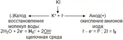 Признаки реакции: выделение газа на катоде и окрашивание околокатодного раствора в малиновый цвет; выделение молекулярного йода коричневой окраски на аноде.