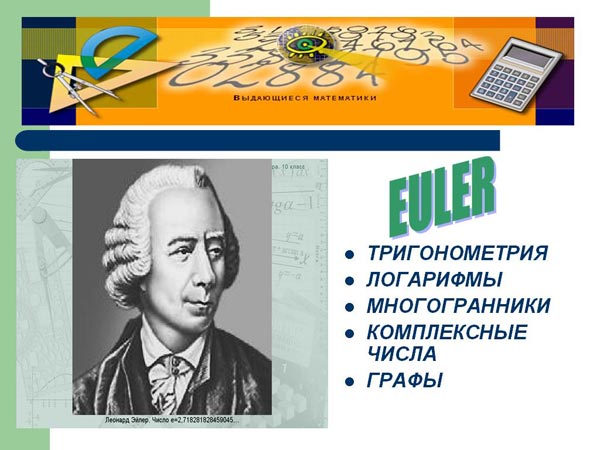 основания натуральных логарифмов. <Рисунок 2>. Леонард Эйлер внёс много нового в разделы математики изучающие тригонометрию, логарифмы, многогранники, комплексные числа,