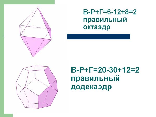 Имя Эйлера носит формула, связывающая число вершин (В), рёбер (Р) и граней (Г) выпуклого многогранника: В - Р + Г = ?. <Рисунок 4>.
