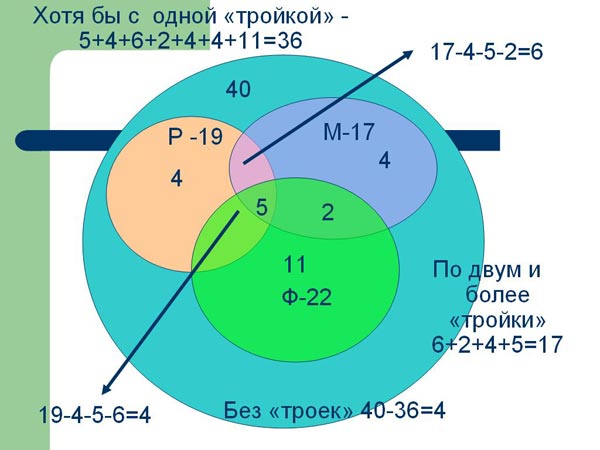 Задача: В классе учатся 40 человек. Из них по русскому языку имеют «тройки» 19 человек, по математике - 17 человек и по физике - 22 человека. Только по одному предмету имеют «тройки»: по русскому языку - 4 человека, по математике - 4 человека и по физике - 11 человек. Семь человек имеют «тройки» и по математике и по физике, из них пятеро имеют тройки и по русскому языку. Сколько человек учатся без «троек». Сколько человек имеют «тройки» по двум из трёх предметов. Рассмотрим решение с помощью следующего слайда <Рисунок 12>.