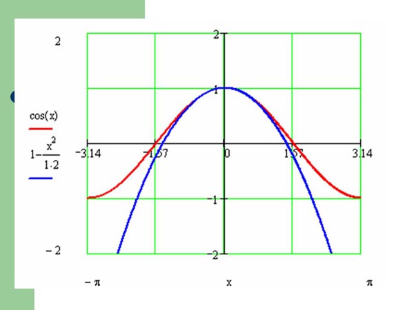 Из рисунка видно, что при значениях х близких к единице графики этих функций почти совпадают <Рисунок 21>. Эйлер получил представление тригонометрических функций синус и косинус в виде суммы функций, в виде многочлена. <Рисунок 22>, <Рисунок 23>.