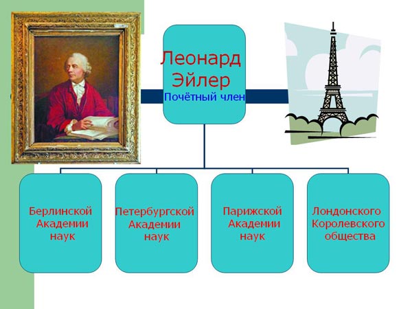 Заслуги Эйлера как крупнейшего учёного и организатора научных исследований получили высокую оценку ещё при его жизни. Помимо Петербургской и Берлинской академий, он состоял членом крупнейших научных учреждений: Парижской АН, Лондонского королевского общества и других. <Рисунок 29>. 3/5 работ Эйлера относится к математике, остальные 2/5 к её приложениям.