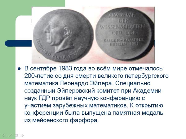 В сентябре 1983 года во всём мире отмечалось 200-летие со дня смерти великого петербургского математика Леонардо Эйлера. Специально созданный Эйлеровский комитет при Академии наук ГДР провёл научную конференцию с участием зарубежных математиков. К открытию конференции была выпущена памятная медаль из мейсенского фарфора. <Рисунок 32>. Вышла в свет марка с портретом Эйлера и одной из наиболее знаменитых его формул, а также конверты с факсимиле его подписи и тиснёным портретом. <Рисунок 33>.