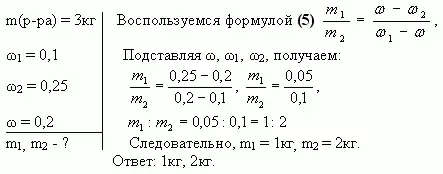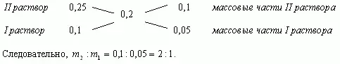 Таким образом, отношение массы первого раствора к массе второго равно отношению разности массовых долей смеси и второго раствора к разности массовых долей первого раствора и смеси.